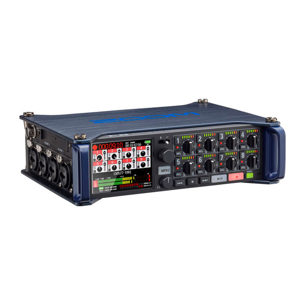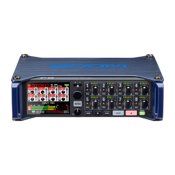 Zoom F8 - портативный десятидорожечный рекордер и восьмиканальный цифровой микшер для записи звука для кинопроизводста/видеопроизводства, восемь микрофонных входов, запись 24-bit/192 kHz, два слота для SD-карт с поддержкой SDXC карт до 512GB, дистанционное управление по Bluetooth посредством программы F8 Control под iOS, слот для подключения микрофонных капсулей модулей Zoom (таких же как и устанавливаются на рекордерах Zoom H5, H6, Q8), фантомное питание на всех входных каналах и индивидуальная регулировка уровня, полноцветный дисплей, удобная система креплений на корпусе и многое другое.