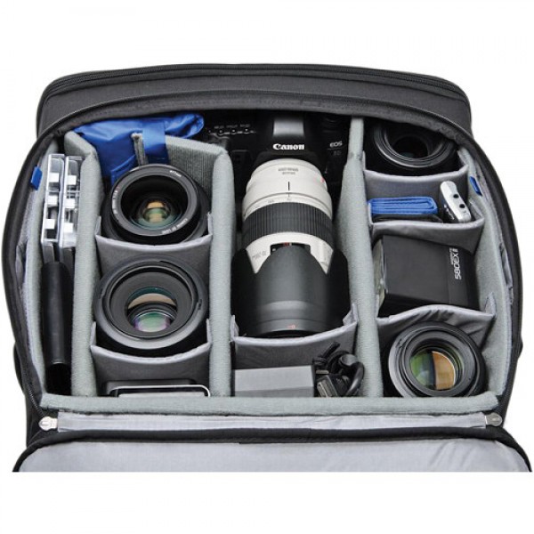 - Вместимость: позволяет перевозить два профессиональных фотоаппарата с установленными телеобъективами 300 или 70-200mm. При этом остается место для дополнительных объективов, вспышек и аксессуаров.
